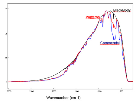 The active substance, „Yule®”, which is our own product, is an artificially produced black ceramic powder with infrared radiation, and has such quality. However, this material, within some parts of infrared range - at the end of the mid-infrared range and at the beginning of the far-infrared range (between wavenumbers 1000-150 cm-1) - radiates stronger, even at human body temperature! This range is important as it is the biologically beneficial part of infrared radiation: it stimulates circulation and is beneficial to the skin. Our Poweros® product, which is impregnated with the black Yule® powder, has the above stated beneficial qualities too.